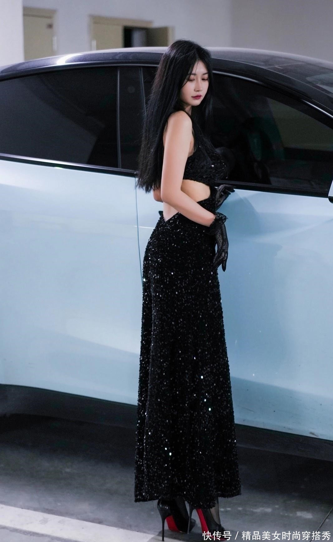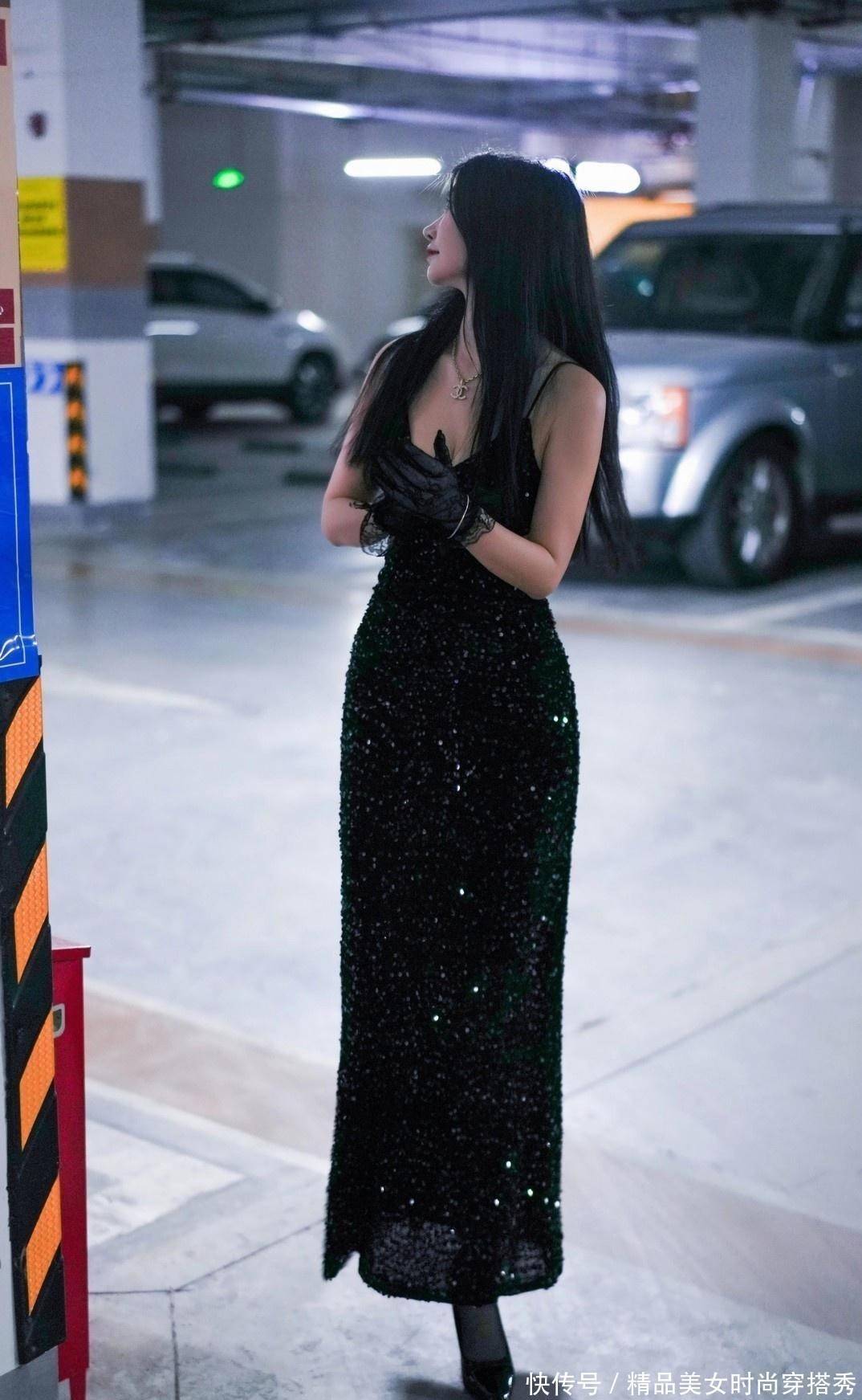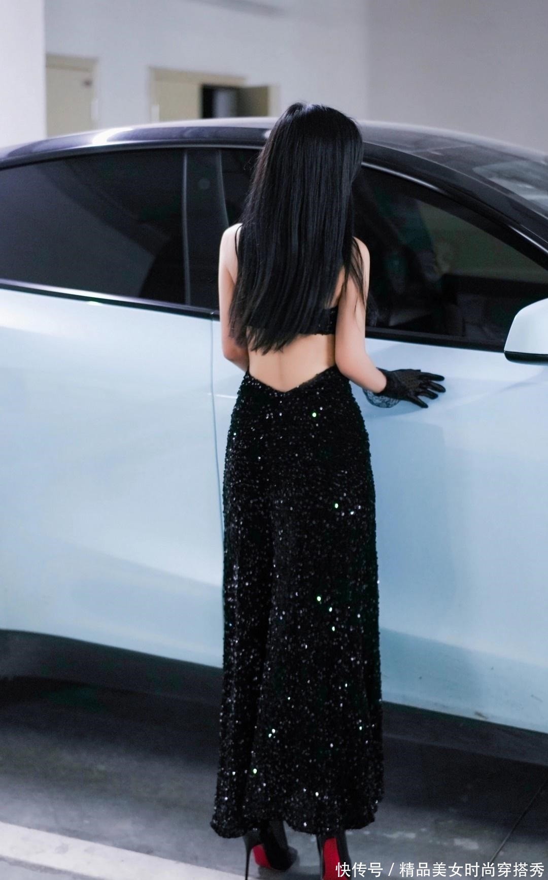 一袭黑色露背长裙,如夜空般深邃神秘,亮片点缀其间,仿佛繁星点点,每一步都摇曳生姿,散发出迷人的光芒。